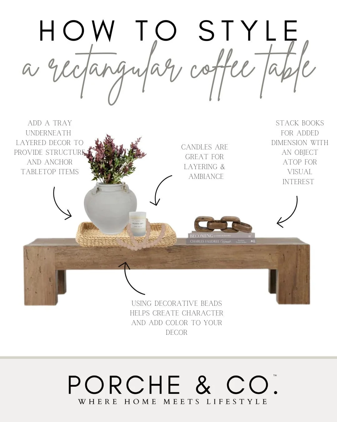 When considering how to style & decorate your coffee table- keep in mind that when styling a round table vs. a rectangle table there arenβt too many differences except the decor on a round table will be arranged in a more triangular fashion and the decor on a rectangular table will be arranged more linear.
